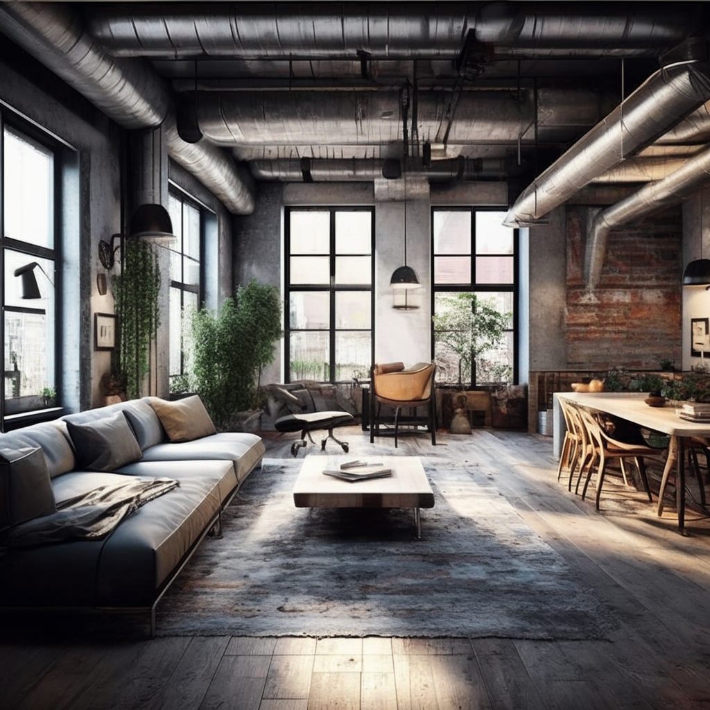 Гостиная | Бетон, кирпич, дерево | Мебель, освещение, ковры | Акцент на комфорте с индустриальными акцентами |